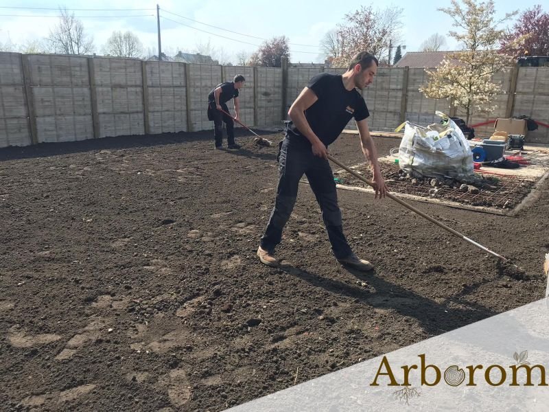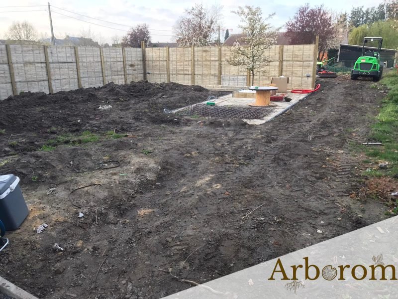 Il faut préparer le sol en le nettoyant des herbes et adventices et retourner la terre plusieurs fois. Si de la terre manque, nous rajoutons quelques m³ de nouvelle terre.