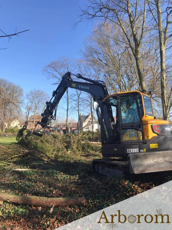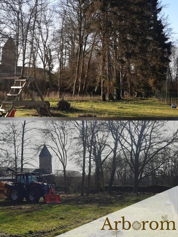L’abattage des arbres a été secondé par notre grue et son grappin pour éviter tout dégât sur la clôture très proche ou sur les arbres sains.