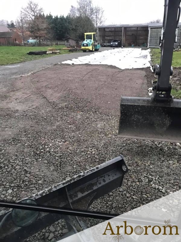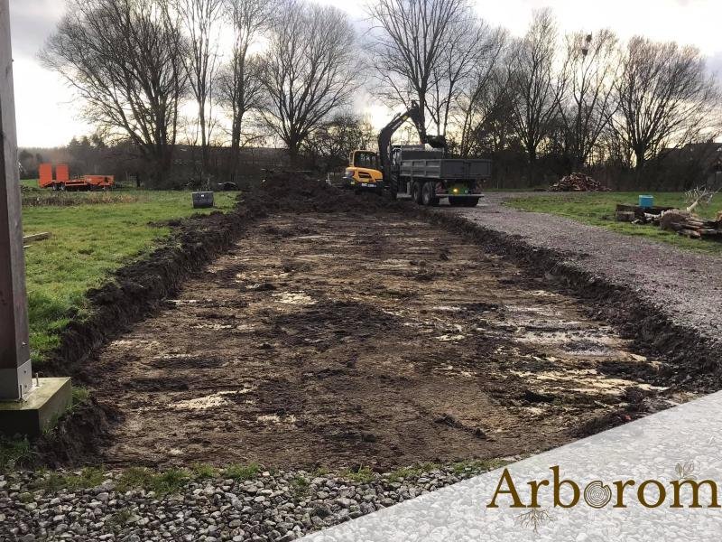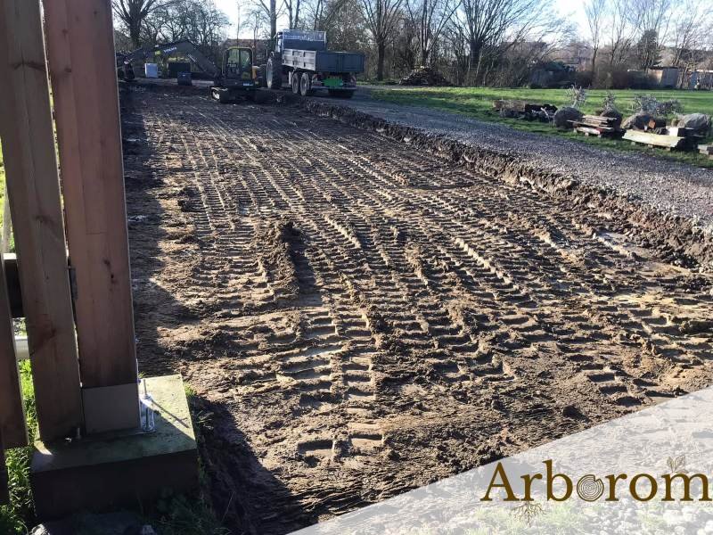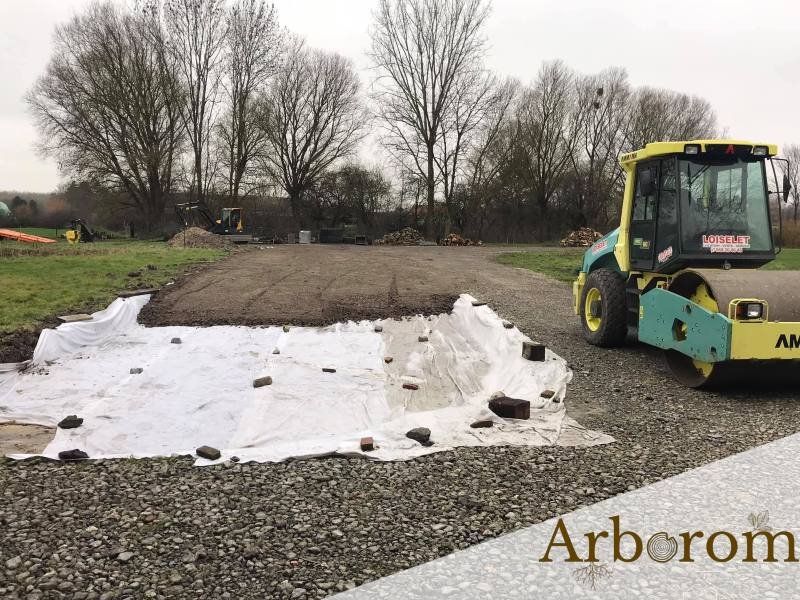 Notre équipe a profité de la trêve hivernale pour agrandir en largeur notre allée principale : terrassement et égalisation du sol, pose d’un géotextile et apport de gravats que nous avons mis en place à la grue.